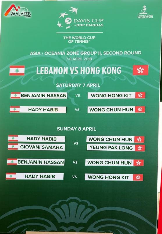 يقام عند الساعة 12.00 من ظهر السبت 7 نيسان الجاري، حفل الافتتاح الرسمي للقاء منتخبي لبنان وهونغ كونغ ضمن الدور نصف النهائي للمجموعة الآسيوية-الأوقيانية الثانية لمسابقة كأس دايفيس التي ينظمها الاتحاد اللبناني للتنس، برعاية وزير الشباب والرياضة محمد فنيش، على ملعب جامعة سيدة اللويزة (زوق مصبح) بحضور الفاعليات السياسية والروحية والعسكرية والرياضية والبلدية وعائلة لعبة التنس وجمهور اللعبة ورجال الصحافة والاعلام .