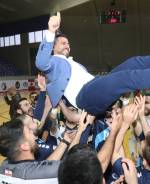 وسلم رئيس لجنة كرة القدم للصالات سيمون الدويهي الكأس غلى كابتن فريق بنك بيروت علي طنيش وسط احتفالات اللاعبين باللقب الخامس في الدوري والـ في مختلف المسابقات.