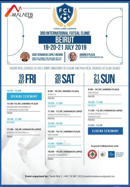 ينظم المدرب الوطني طارق رزق النسخة الثالثة من دورة المدربين الدولية في الفوتسال " Futsal Clinic Lebanon " (ذكورا واناثا) في 19 و20 و21 تموز المقبل، بالتعاون مع جامعة الروح القدس (الكسليك) وتحت اشراف الاتحاد اللبناني لكرة القدم.