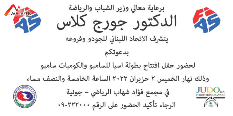 دعا الاتحاد اللبناني للجودو وفروعه إلى حضور حفل إفتتاح بطولة آسيا للسامبو والكومبات سامبو التي ينظمها بين 2 و4 حزيران 2022 برعاية ويزر الشباب والرياضة الدكتور جورج كلاس، وذلك عند الساعة 17.30 من بعد ظهر الخميس 2 حزيران في قاعة مجمع الرئيس فؤاد شهاب في جونية.