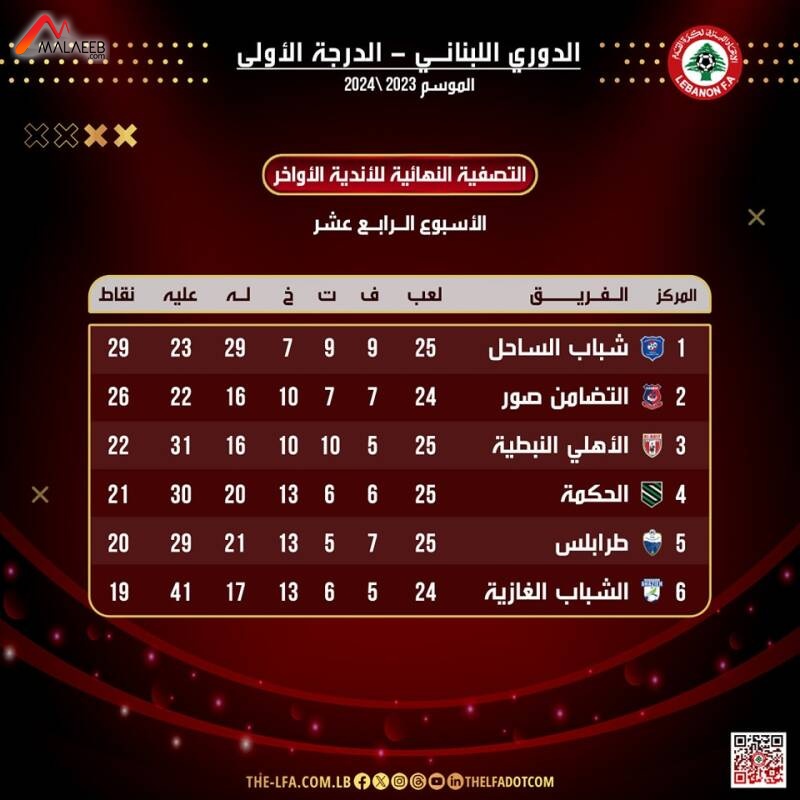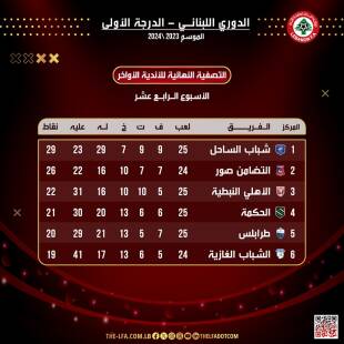 وبات رصيد الحكمة 21 نقطة، فيما رفع التضامن صور الذي للمفارقة خسر مباريات بنتائج لافتة إلى 26 نقطة مع تعليق نتيجة خسارته امام الغازية 0-5.