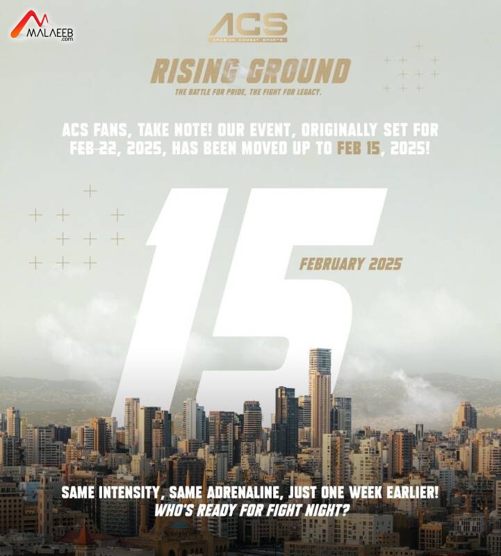 تنظّم منظمة "آي سي أس"(ACS)  أمسية رياضية قتالية السبت 15 شباط الجاري في مدينة كميل شمعون الرياضية في بيروت، ويحمل الحدث الرياضي عنوان Rising Ground.
