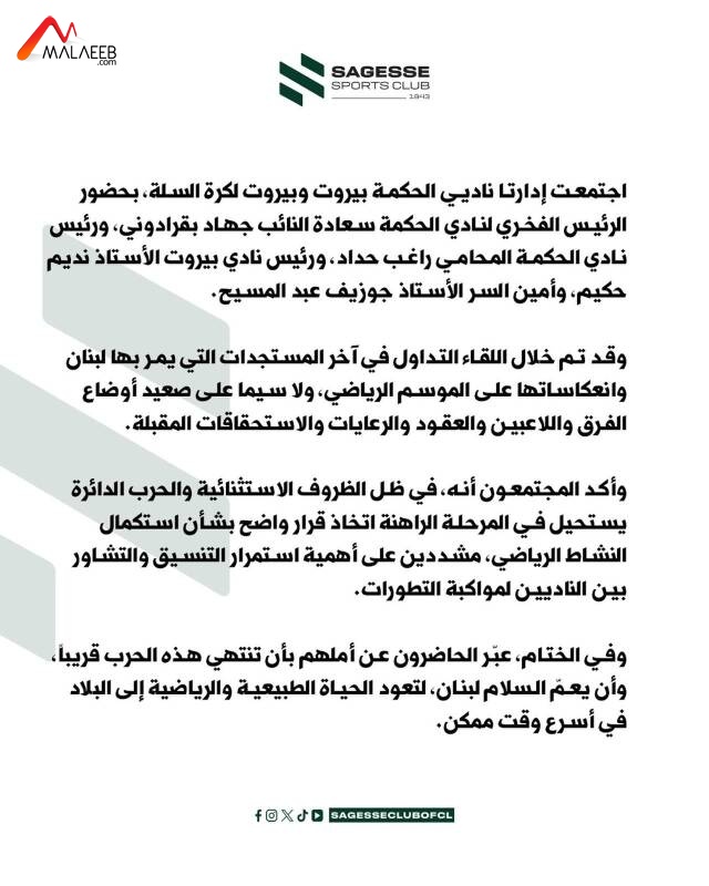 نشر نادي الحكمة الرياضي – بيروت ونادي بيروت فيرست على صفحاتهما على مواقع التواصل الاجتماعي البيان الآتي: