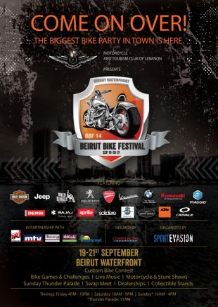 ينظّم النادي اللبناني للدراجات و السياحة "مهرجان بيروت الأول للدراجات النارية" في الواجهة البحرية للعاصمة اللبنانية  بيروت حيث يعرض وكلاء الدراجات الآلية احدث ماأنتج  من مصانعها، ضمن مساحة مخصصة لمدة ثلاثة ايام في 19 و20 و21 ايلول الجاري .ويتخلّل المهرجان عروضاً شيقة  للمحترف العالميروك بوغوروف و تحدي مهارات القيادة و عرضcustom bike show  و غيرها , بالاضافة الى عروض الفرق الموسيقية في المساء.