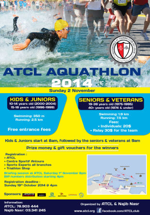 ينظّم النادي اللبناني للسيارات والسياحة مسابقة أكواتلون الأحد الواقع في 2 تشرين الثاني المقبل في مقرّه في الكسليك برعاية "سبور اكسبير" و"كومرشال انشورنس" و"اكس اكس ال   اينيرجي درينك" .وتضم المسابقة سباحة وركض  في سباق مفتوح امام اربع فئات عمرية للاناث والذكور وهي :فئة 10-14 سنة،فئة 15-18سنة،فئة 19-39 سنة وفئة 40 سنة وما فوق.وخُصّصت جوائز مالية وعينية للفائزين والفائزات .وانطلقت عملية التسجيل في مقر النادي وفي "ترياتلون شوب"(زوق مكايل)  وفي جميع فروع "سبور اكسبير" او عبر الاتصال المدرب نجيب نصر على الرقم: